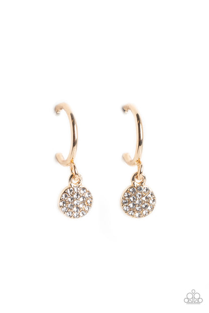 Swinging from a glistening gold hoop, a dainty gold disc, embossed with white rhinestones glimmers, adding a subtle shimmer around the ear. Earring attaches to a standard post fitting. Hoop measures approximately 1/2" in diameter.