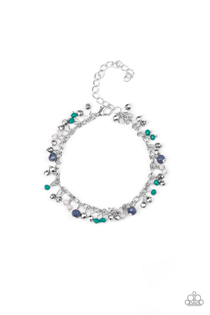 A variety of faceted Arcadia, Sailor Blue, and Harbor Mist beads swing from a shimmery silver chain, creating a flirtatious fringe around the wrist. Faceted silver beads trickle between the colorful beads, adding a hint of shimmer to the seasonal design. Features an adjustable clasp closure.