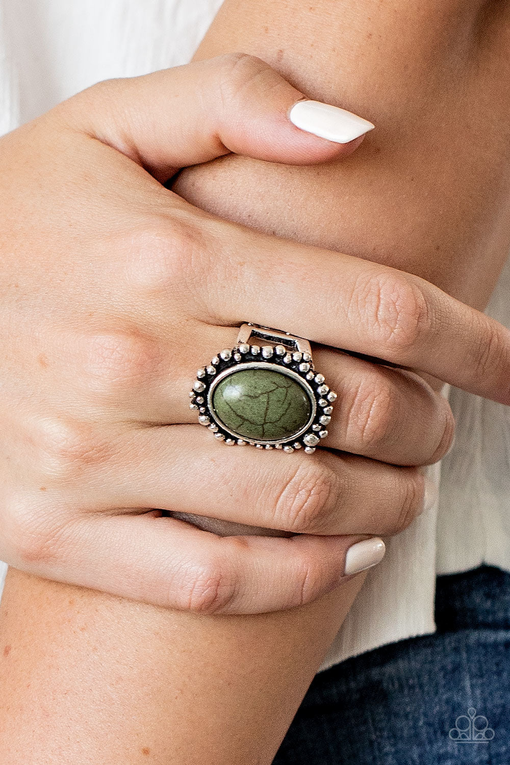 An oval Military Olive stone is pressed into a rustic silver frame radiating with antiqued silver studs, creating an earthy centerpiece atop the finger. Features a stretchy band for a flexible fit.