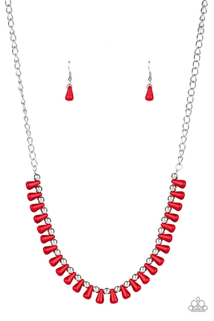 Paparazzi Necklace ~ Extinct Species - Red - Red teardrop stones and classic silver beads are threaded along an invisible wire. The earthy beads alternate below the collar, creating a wild fringe. Features an adjustable clasp closure.