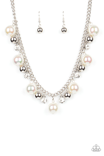 An oversized collection of shiny silver beads, white rhinestone accents, and iridescent pearls dangle from a classic silver chain, creating a stellar fringe below the collar. Features an adjustable clasp closure.