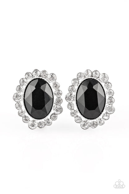 Varying in size, dainty white rhinestones spin around a faceted black gem for a timeless look. Earring attaches to a standard post fitting.