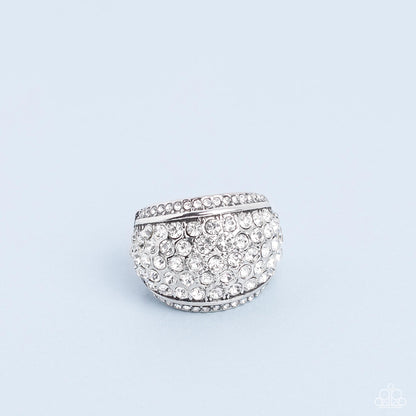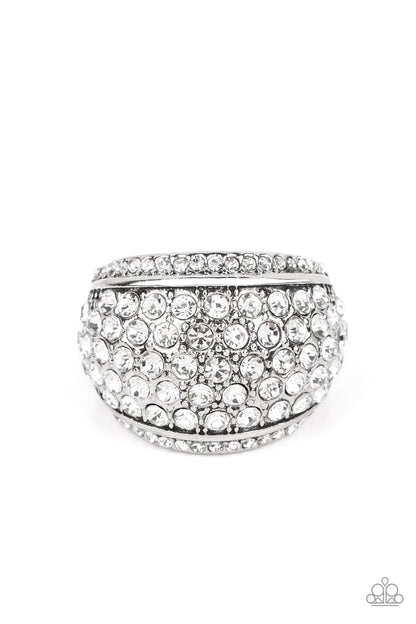 A thick band of silver arcs across the top of the finger, creating an exaggerated rounded frame. Countless tiny white rhinestones scatter across the surface, as straight lines of even more rhinestones line the outer edges in a blinding finish. Features a stretchy band for a flexible fit.