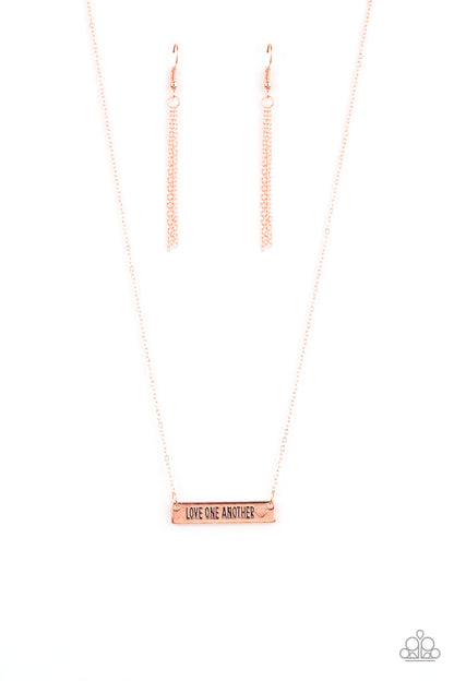 Featuring an airy heart cut-out, a dainty shiny copper frame is stamped in the phrase, "Love One Another", for an inspirational finish. Features an adjustable clasp closure.