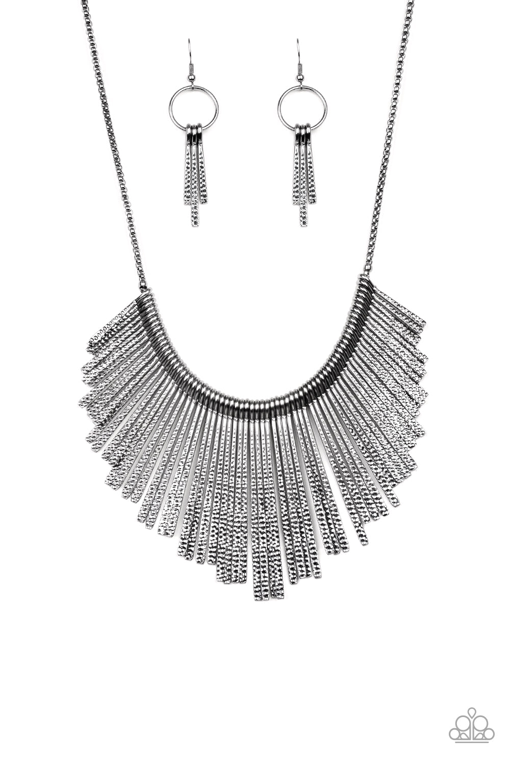 Paparazzi Necklace ~ Metallic Mane - Black - Textured gunmetal rods flare out from the bottom of a rounded gunmetal chain, creating a tapered fringe below the collar for a statement-making finish. Features an adjustable clasp closure.
