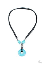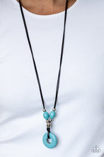 A refreshing turquoise stone disc is knotted in place at the bottom of shiny black cording decorated in matching turquoise stone and ornate silver beads, creating an earthy display below the collar. Features an adjustable sliding knot closure.