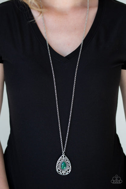 A glowing green moonstone is pressed into the center of a silver teardrop pendant swirling with regal filigree for a regal finish. Features an adjustable clasp closure.