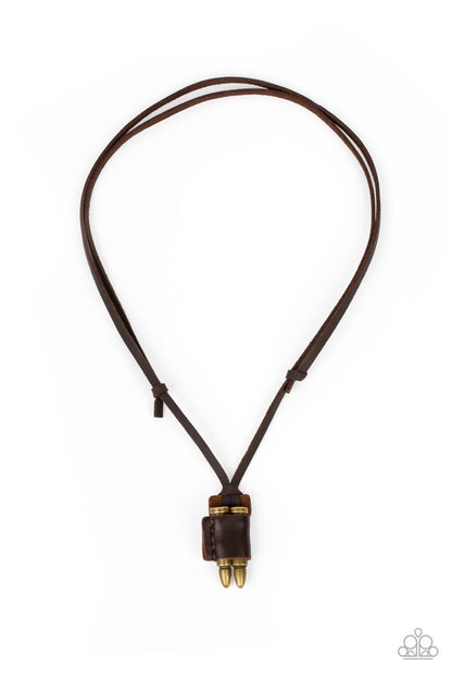 A piece of brown leather wraps around a pair of brass bullets, creating an edgy urban pendant at the bottom of knotted strands of brown leather. Features an adjustable sliding knot closure.