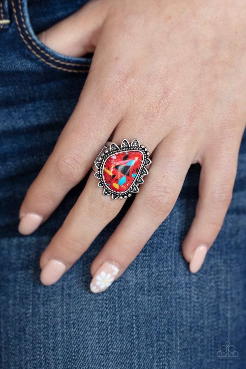 A fiery asymmetrical red stone, infused with flecks of multicolored accents is encased in an antiqued silver frame. The decorative frame features a collection of rope and studded silver texture resulting in a rustic provincial finish atop the finger. Features a stretchy band for a flexible fit.