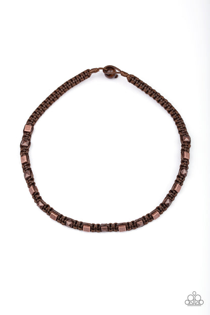 A collection of square and faceted copper beads are knotted in place along a braided brown cord for an urban look below the collar. Features a button loop closure.