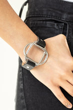 Infused with black leather bands, swirling silver bars delicately knot into a stacked silver frame atop the wrist for a nautical inspired fashion. Features an adjustable snap closure.