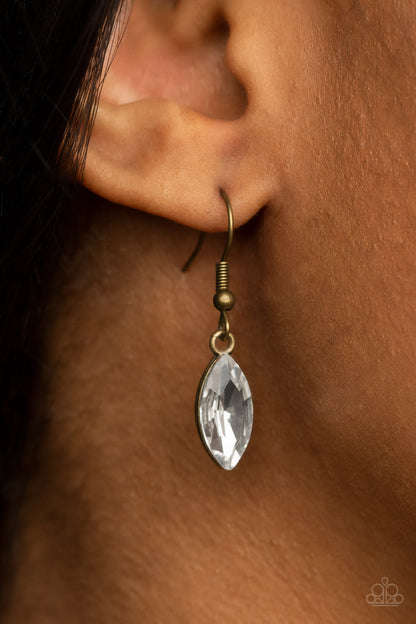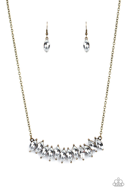 Paparazzi Necklace ~ Icy Intensity - Brass Necklace With White Rhinestones - Featuring rustic brass frames, a regal row of marquise cut white rhinestones stagger below the collar, coalescing into an icy pendant. Features an adjustable clasp closure.