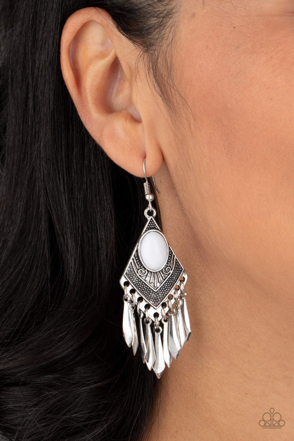 A polished white bead is pressed into a diamond shaped frame radiating with tribal inspired details. Flared silver bars swing from the bottom of the ornate lure, creating a shiny fringe. Earring attaches to a standard fishhook fitting.