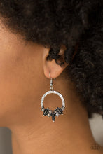 Featuring round and emerald style cuts, radiant hematite and black rhinestones are encrusted along the bottom of an ornate silver hoop for an edgy look. Earring attaches to a standard fishhook fitting.