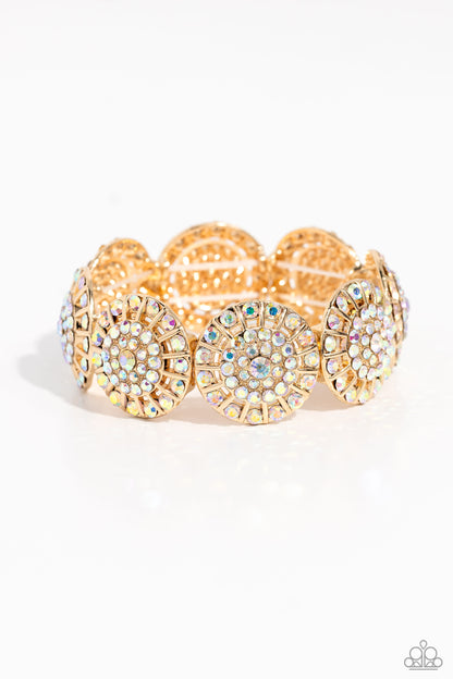 Featuring a wheel motif, concaved gold discs embossed in an explosion of iridescent rhinestones slide along a stretchy band around the wrist for a hint of dazzling refinement. Due to its prismatic palette, color may vary.