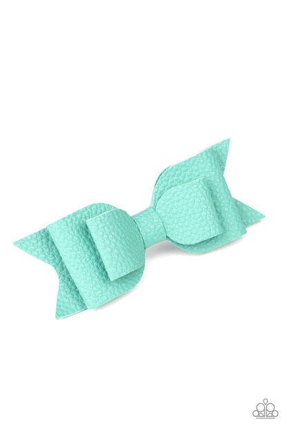Painted in a minty green finish, textured leather ties into a flirtatious hair bow. Features a standard hair clip on the back.