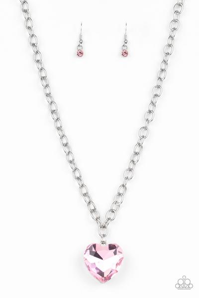 Paparazzi Accessories Flirtatiously Flashy - Pink Necklaces set atop a sleek silver fitting, a glittery pink heart-shaped gem swings from the bottom of a classic silver chain below the collar for a whimsical look. Features an adjustable clasp closure.