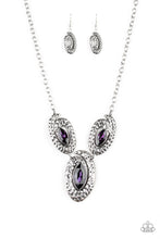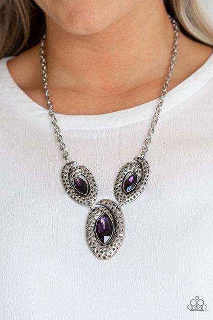 A trio of glittery purple marquise-cut rhinestones are nestled inside swirls of hammered silver frames, creating a dazzling statement piece below the collar. Features an adjustable clasp closure.