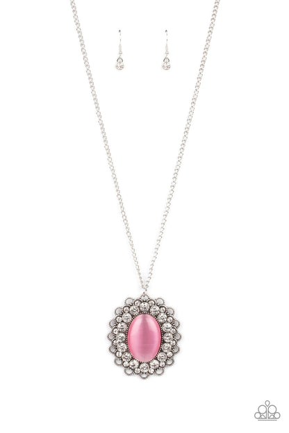 Paparazzi Necklace ~ Oh My Medallion - Pink Cat's Eye Stone Necklace - Bordered in bubbly white rhinestone encrusted petals, the center of a studded silver floral frame is dotted with an oversized pink cat's eye stone, creating a whimsical medallion at the bottom of a lengthened silver chain. Features an adjustable clasp closure.