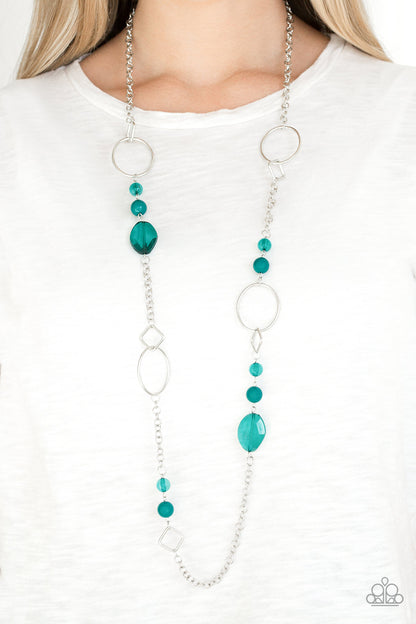 Polished and glassy Quetzal Green beads trickle along a shimmery silver chain featuring round and square frames for a seasonal look. Features an adjustable clasp closure.