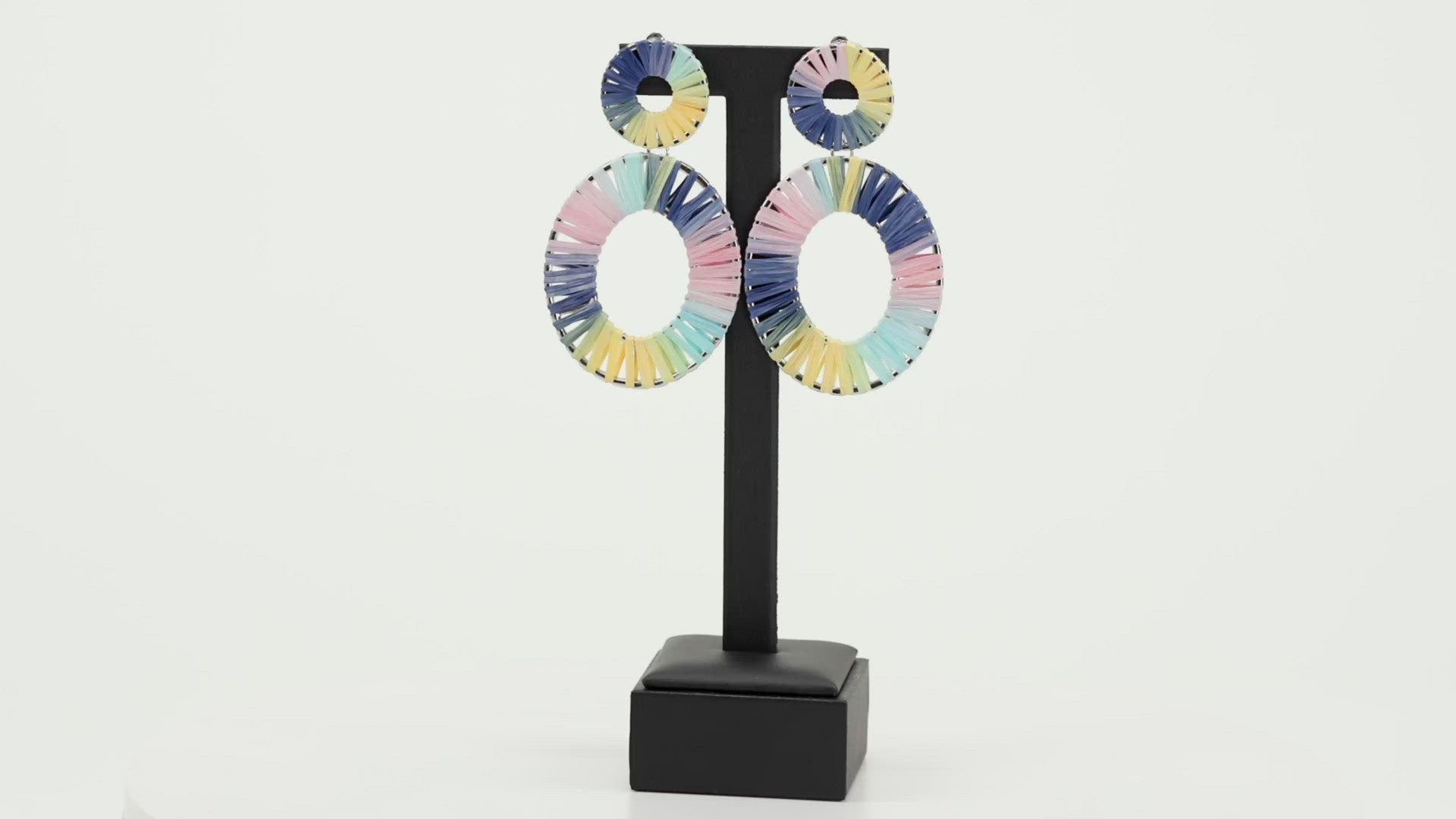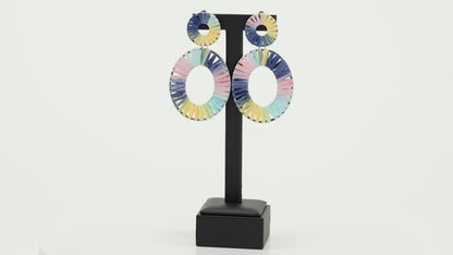 Tie dyed wicker-like accents wrap around an oversized silver oval and dainty circular frame, linking into a colorful lure. Earring attaches to a standard post fitting.
