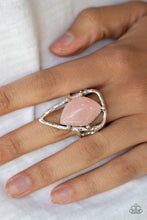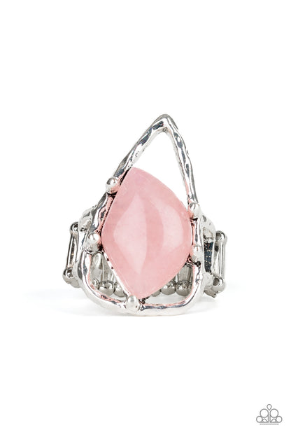 An abstract pink stone is nestled inside a hammered silver triangle, creating an artisan inspired frame atop the finger. Features a stretchy band for a flexible fit.