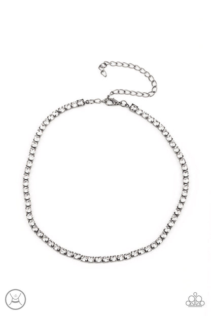 A strand of brilliant white rhinestones set in classic gunmetal fittings creates a stunningly radiant display across the collar. Features an adjustable clasp closure.