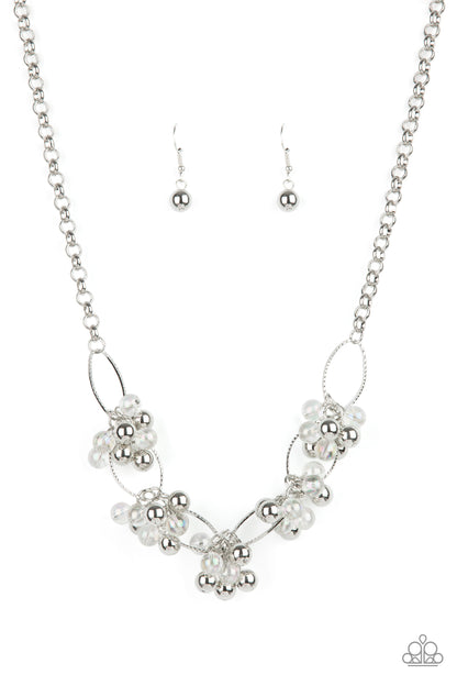 Clusters of glassy iridescent and shiny silver beads link with textured silver ovals, creating a bubbly effervescence below the collar. Features an adjustable clasp closure.