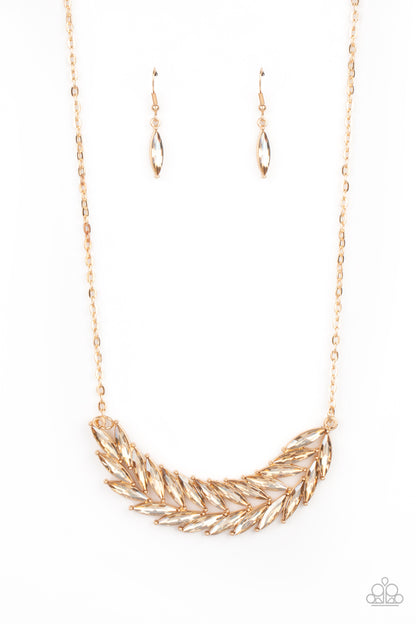 Paparazzi Necklace ~ Flight of FANCINESS - Gold - A glittery collection of golden marquise rhinestones delicately connect into a twinkly feather, creating a sparkly stationary pendant below the collar. Features an adjustable clasp closure.