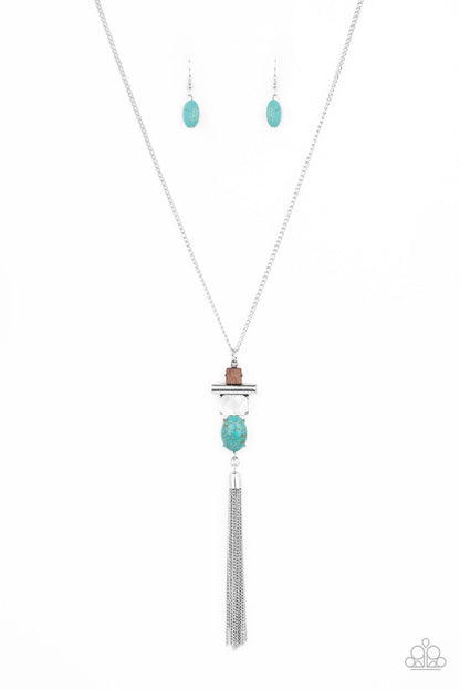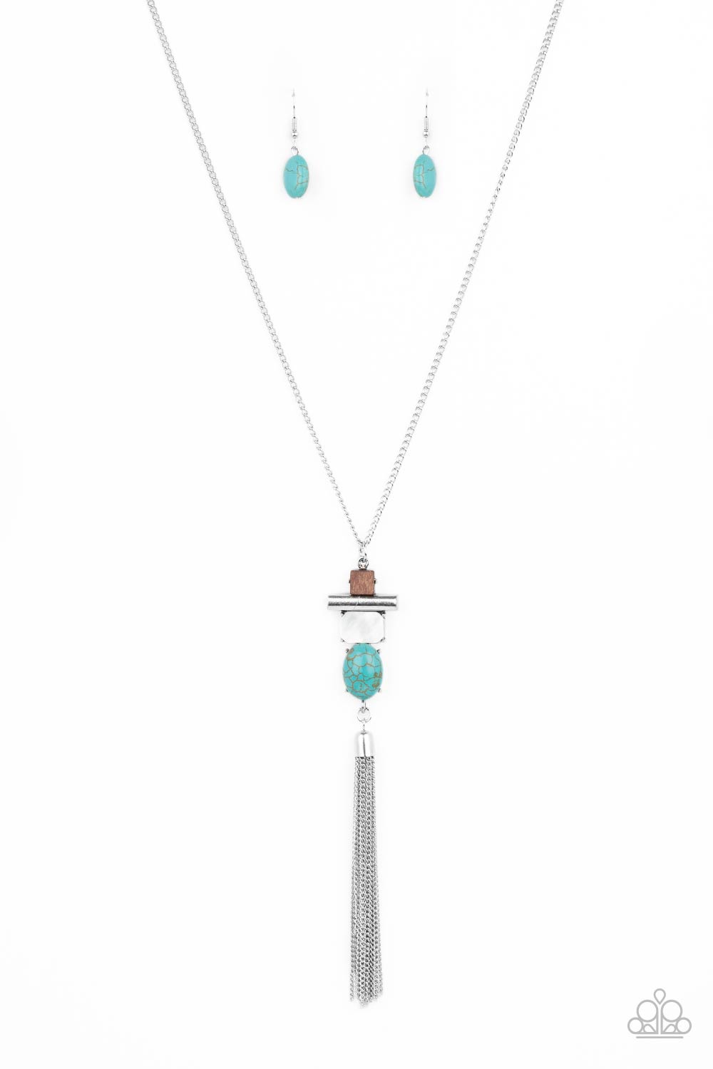 Paparazzi Necklace ~ Natural Novice - Blue - A square wooden frame, silver rod, piece of white shell, and oval turquoise stone stack into a seasonal pendant at the bottom of a lengthened silver chain. A shimmery silver chain tassel swings from the frame, adding playful movement to the earthy display. Features an adjustable clasp closure.