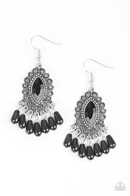 A faceted black bead is pressed into the center of a studded silver frame radiating with antiqued filigree. Matching black beads swing from the bottom of the frame, creating a whimsical fringe. Earring attaches to a standard fishhook fitting.