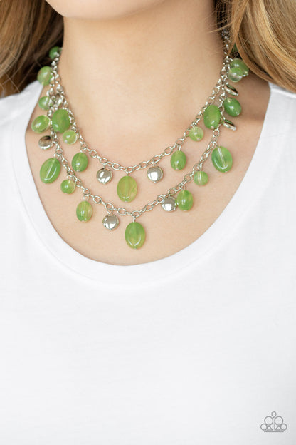 Paparazzi Necklace ~ Rainbow Shine - Green - Infused with flat silver beads, an array of glassy green beads dangle from the bottoms of two shimmery silver chains, creating a whimsically layered fringe below the collar. Features an adjustable clasp closure.
