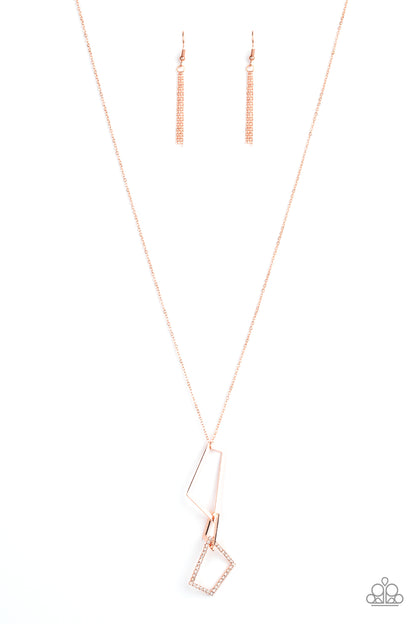 Paparazzi Necklace ~ Shapely Silhouettes - Copper - A mismatched collection of white rhinestone encrusted and shiny copper trapezoid frames connect at the bottom of a lengthened shiny copper chain, creating an abstract pendant. Features an adjustable clasp closure.