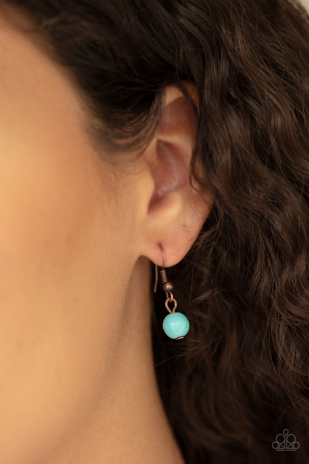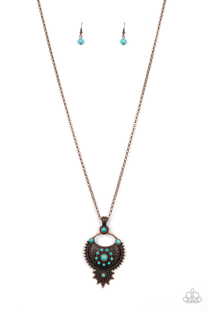Paparazzi Necklace ~ Solar Energy - Copper - Dotted with dainty turquoise stones, an ornately studded copper frame swings from the bottom of a decorative copper fitting. Infused with a lengthened copper chain, the rustic frame is brushed in an antiqued finish for a seasonal look. Features an adjustable clasp closure.
