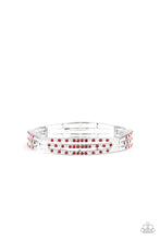 Paparazzi Suburban Scene - Red Bracelet - Sporadically dotted in rows of glittery red rhinestones and shiny silver studs, stacked silver frames are threaded along a stretchy band around the wrist for a refined look.