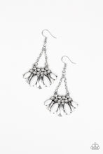 A collision of white marquise beads, sleek silver triangular frames, and a faceted silver teardrop coalesce at the bottom of a studded and chain-link frame for a wild tribal inspired look. Earring attaches to a standard fishhook fitting.